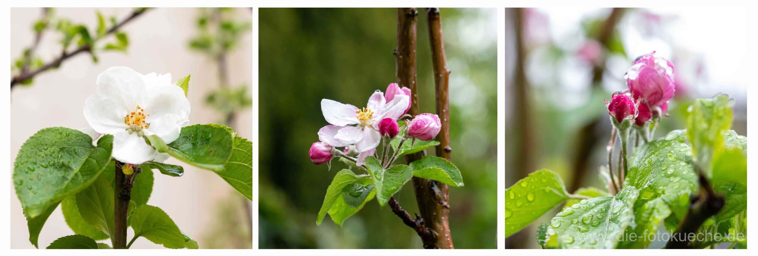 April 2026 - Obstblüte im Alten Obsthof: Links die Rubinette, Mitte und rechts die Sorte "Blauer Kölner"