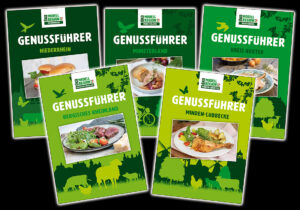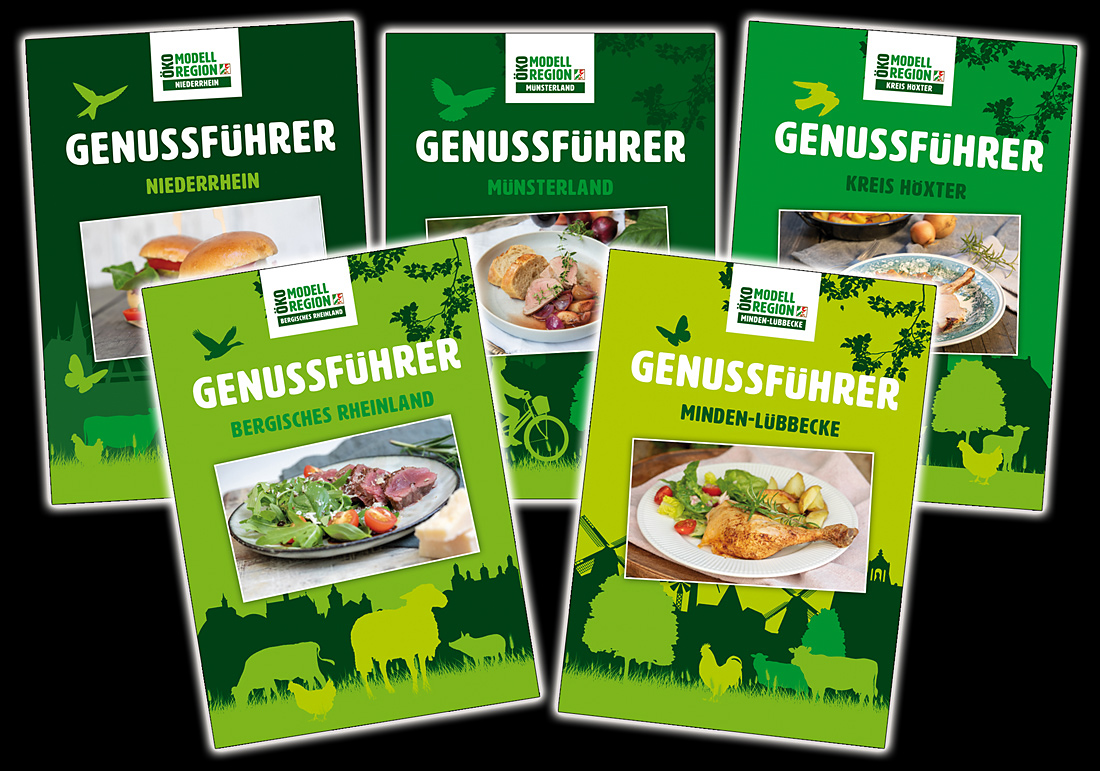 Fünf Genussführer laden seit 2025 zu einer kulinarischen Entdeckungsreise durch das Bergische Rheinland, das Münsterland, den Kreis Höxter, die Region Minden-Lübbecke und die Region Niederrhein ein. Portraits ausgewählter Bio-Lebensmittel, wissenswerte Hintergründe und Rezepte wohlschmeckender Gerichte reihen sich aneinander.