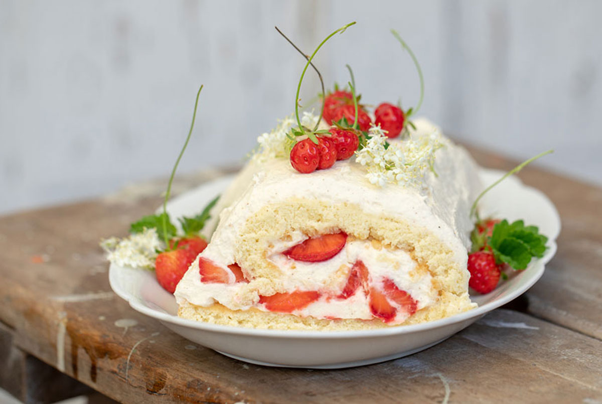 Biskuitrolle mit Erdbeeren und Holunderblüten-Sahne
